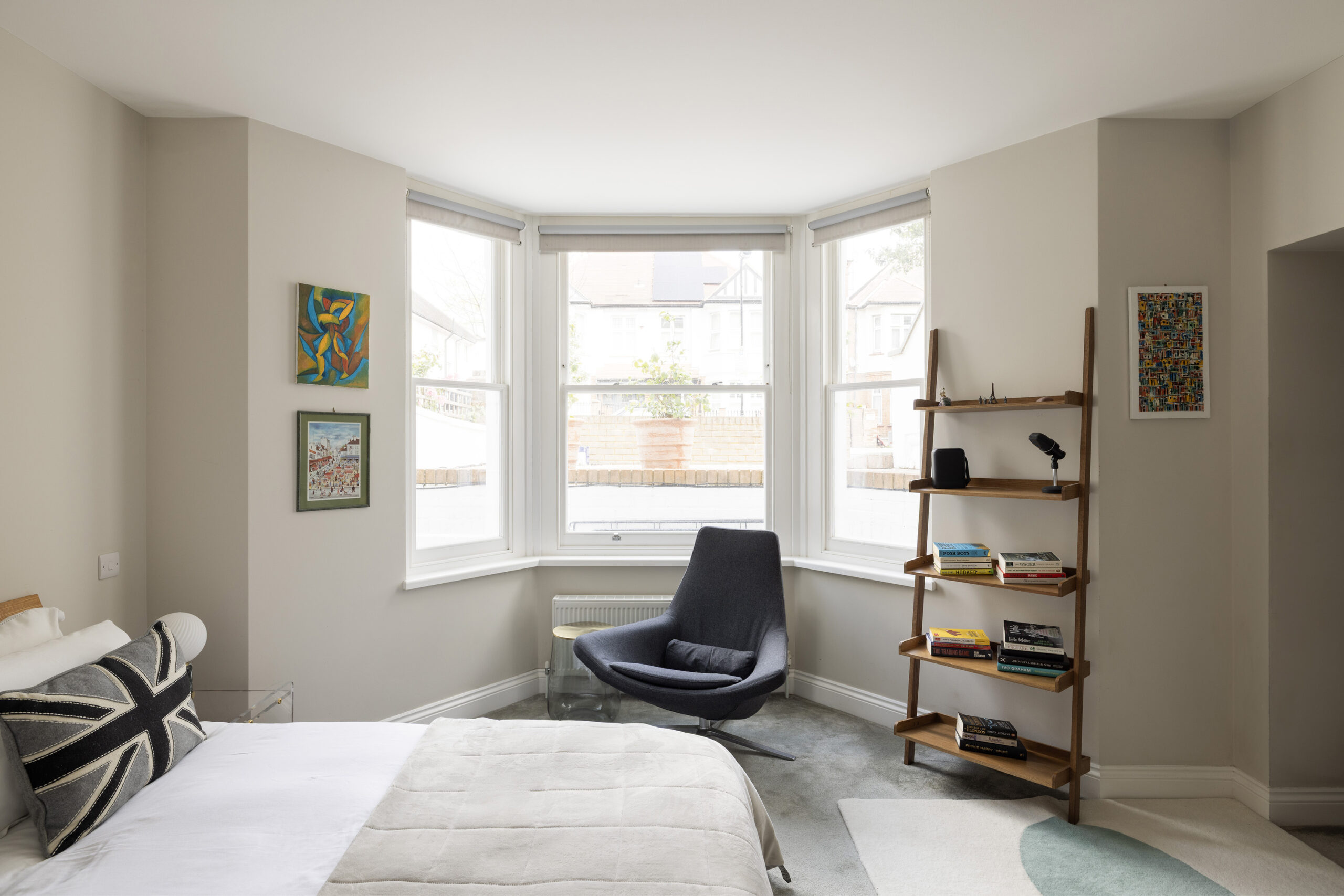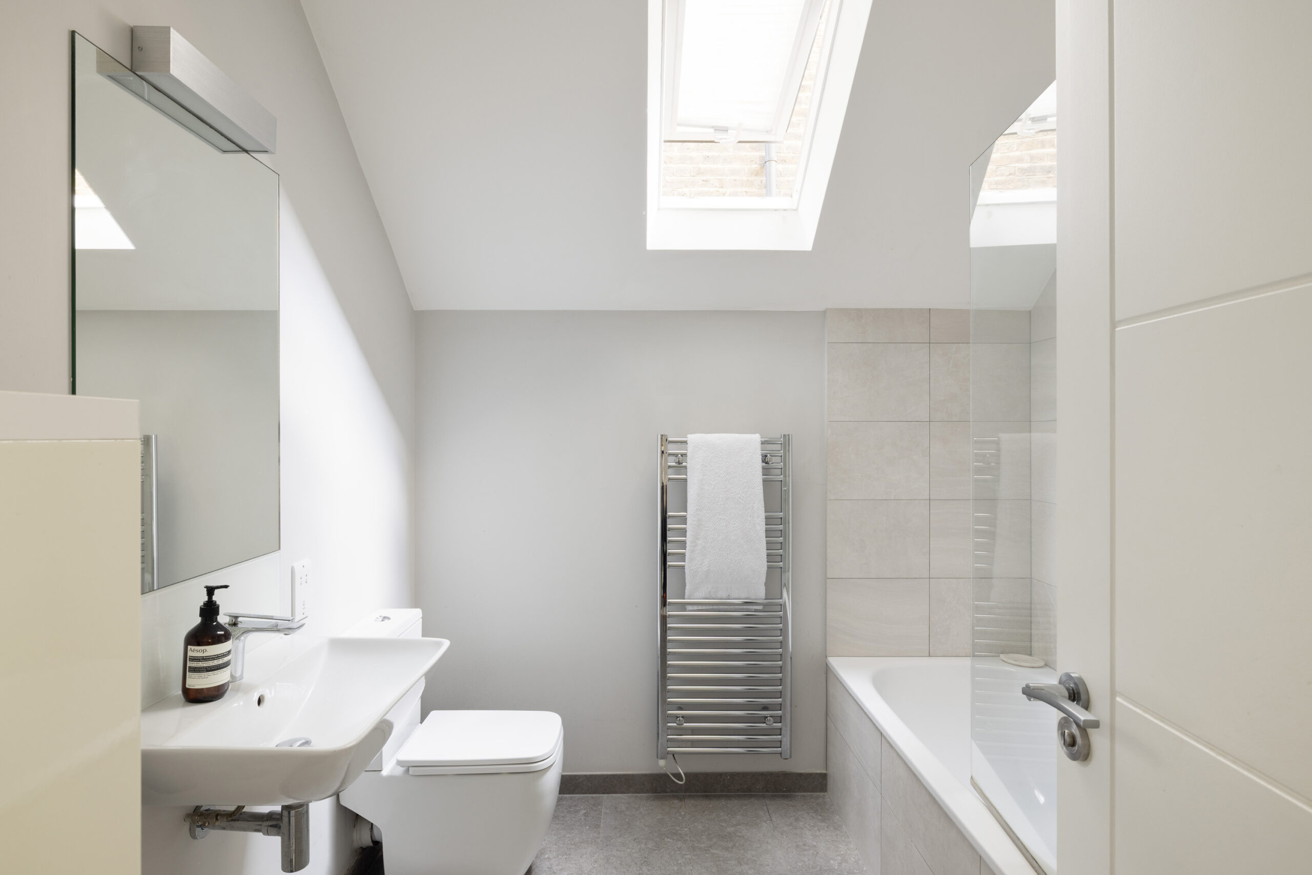 Inside, the home’s sleeping quarters are just as considered. At the front, the principal bedroom is illuminated by a generous bay window, while an en suite bathroom adds a layer of luxury with a rainfall shower and freestanding basin. A second bedroom overlooks the garden and features bespoke storage and a Velux window, maximising the light. A third, smaller room offers flexibility – ideal as a nursery, guest room or study. A family bathroom with a shower-bath and roof window completes the home.