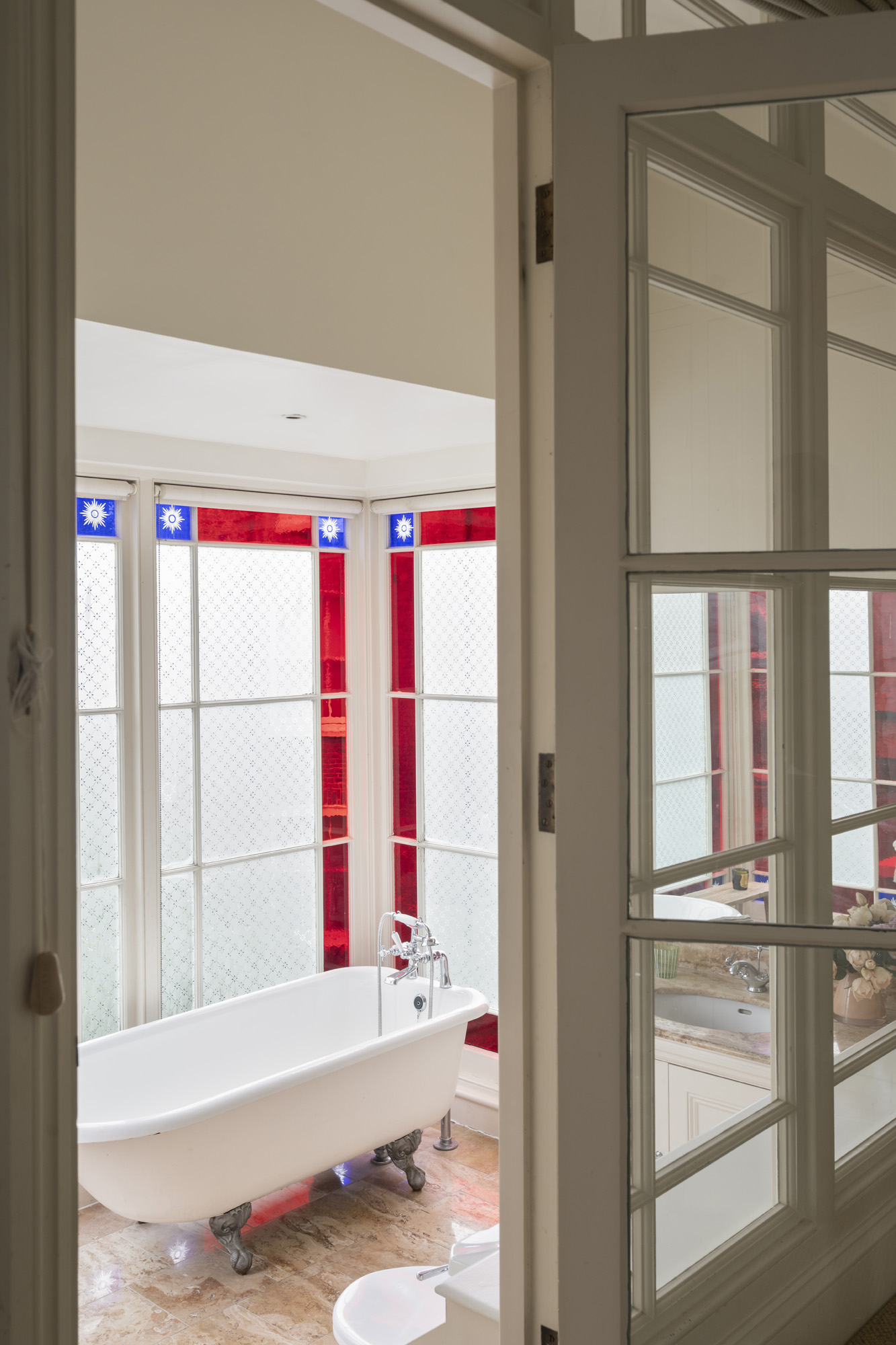 Matching the home’s social heart, the principal bedroom suite is all soft tones and reams of natural light, setting a serene canvas for interior creativity. Interior French doors lead into the en suite bathroom, which enjoys a freestanding bath backdropped by full-height stained-glass windows. Completing the home is a guest bedroom and separate bathroom.