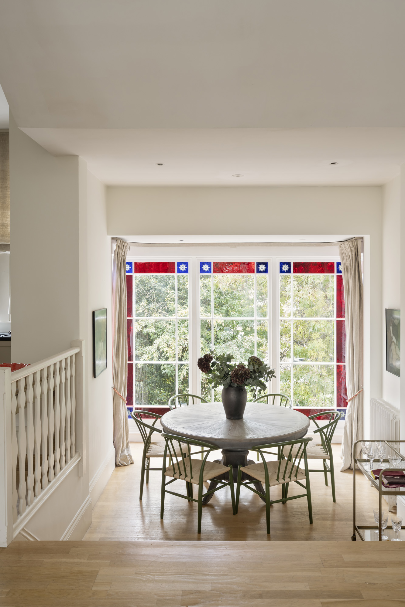 Cleverly zoned via a set of steps, the dining room is similarly sun-drenched through large stained-glass windows that look out to leafy vistas. It’s a tranquil setting for entertaining, served by the shaker-style kitchen next door. Here, muted cabinetry and smooth worktops make for a stylish and streamlined culinary setting.