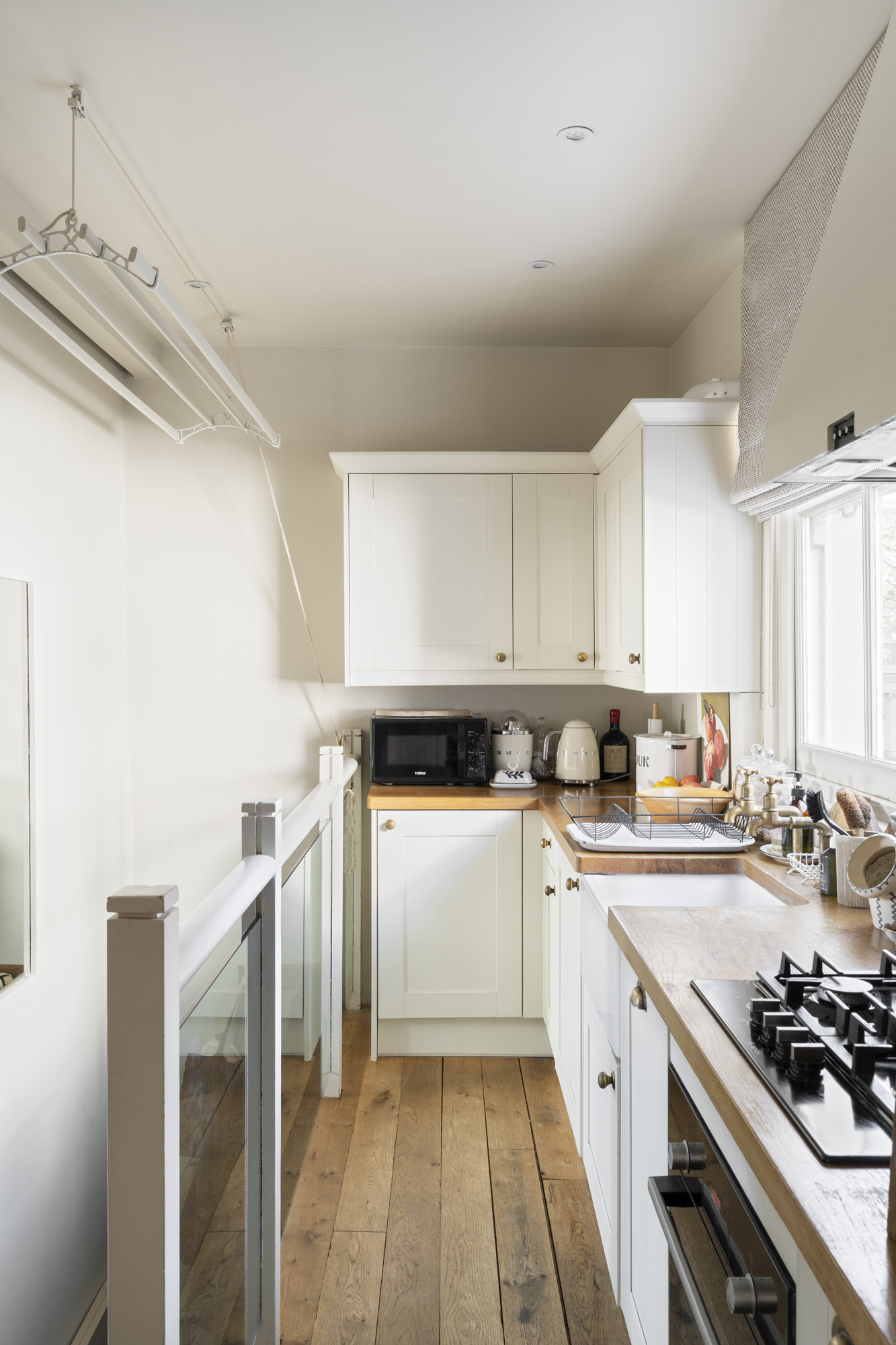 Ascending the sky-lit stairs to the second floor, the guest bedroom is calm and considered, with integrated storage, cast-iron radiators and southeast-facing windows. The home’s bathroom shares this floor and features a shower adorned with artisan porcelain tiles, a towel rail and hidden storage.