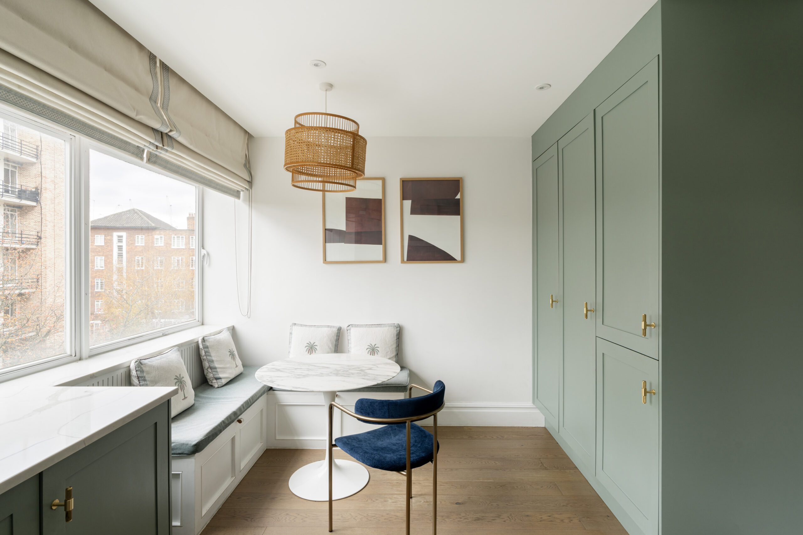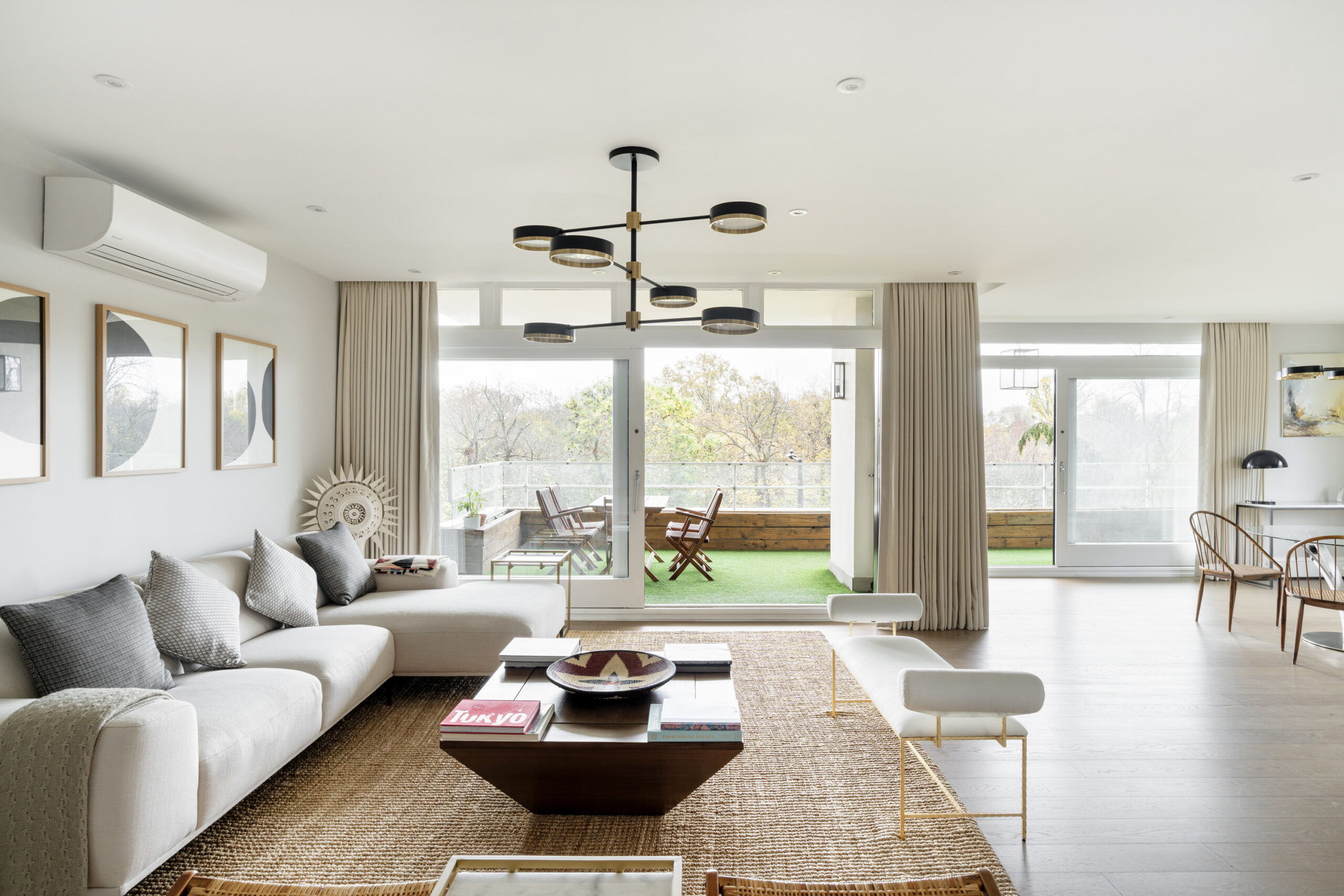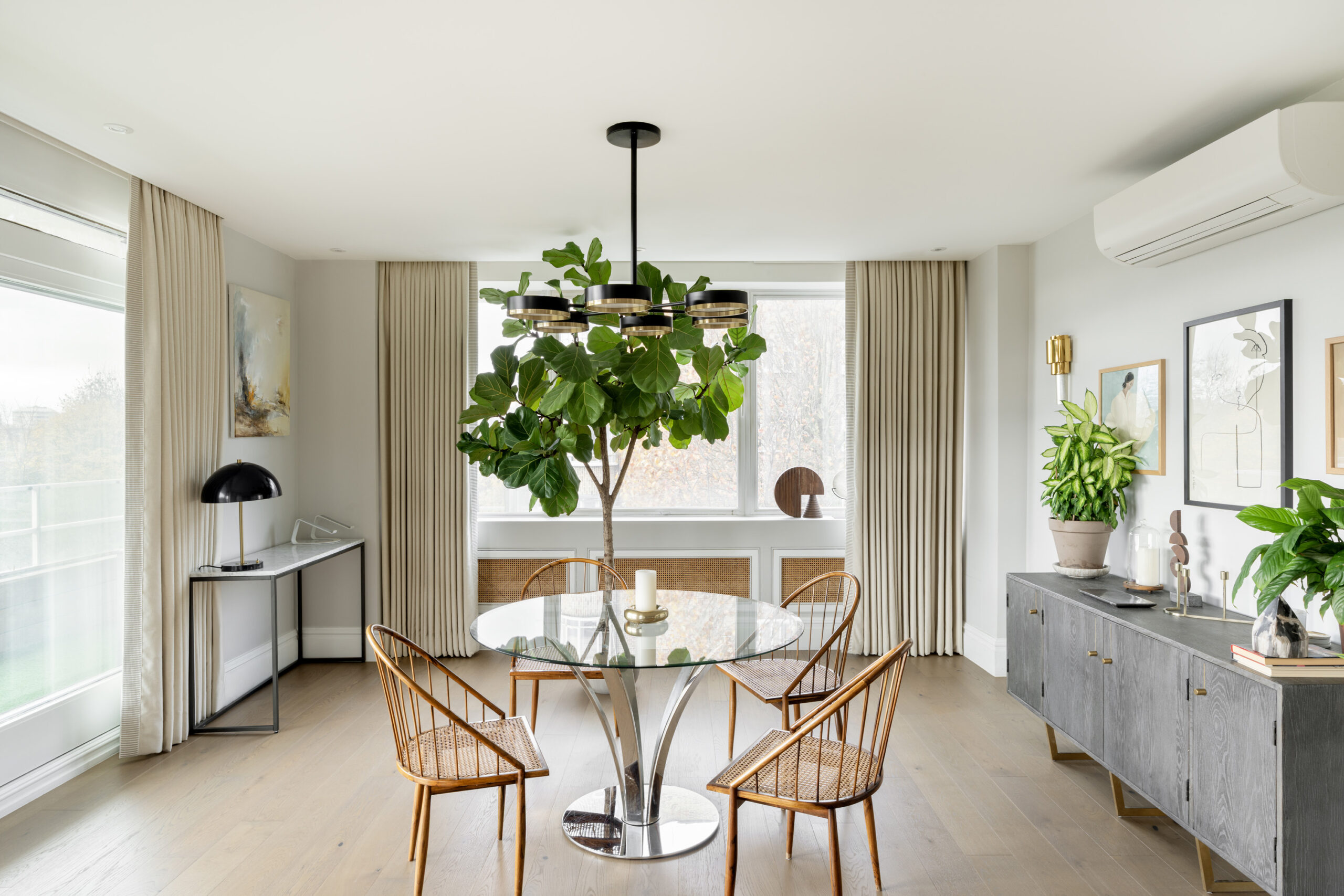 Entering on the third floor into the open-plan dining and reception room, you are introduced with solid wood floors and a pared-back colour scheme. There’s a voluminous feel to the space, with wall-to-wall window glazing, that floods the interiors with natural light, whilst offering leafy vistas out to Regent’s Park. In the lounge area, a minimalist Eichholtz sofa and a woven rug sits beneath a striking Sunpan Oswin chandelier. Adjacent, there’s a glass dining table paired with Jaoquim Tenreiro chairs. Throughout the home, Heatmiser underfloor heating and Daikin air conditioning keep things comfortable.