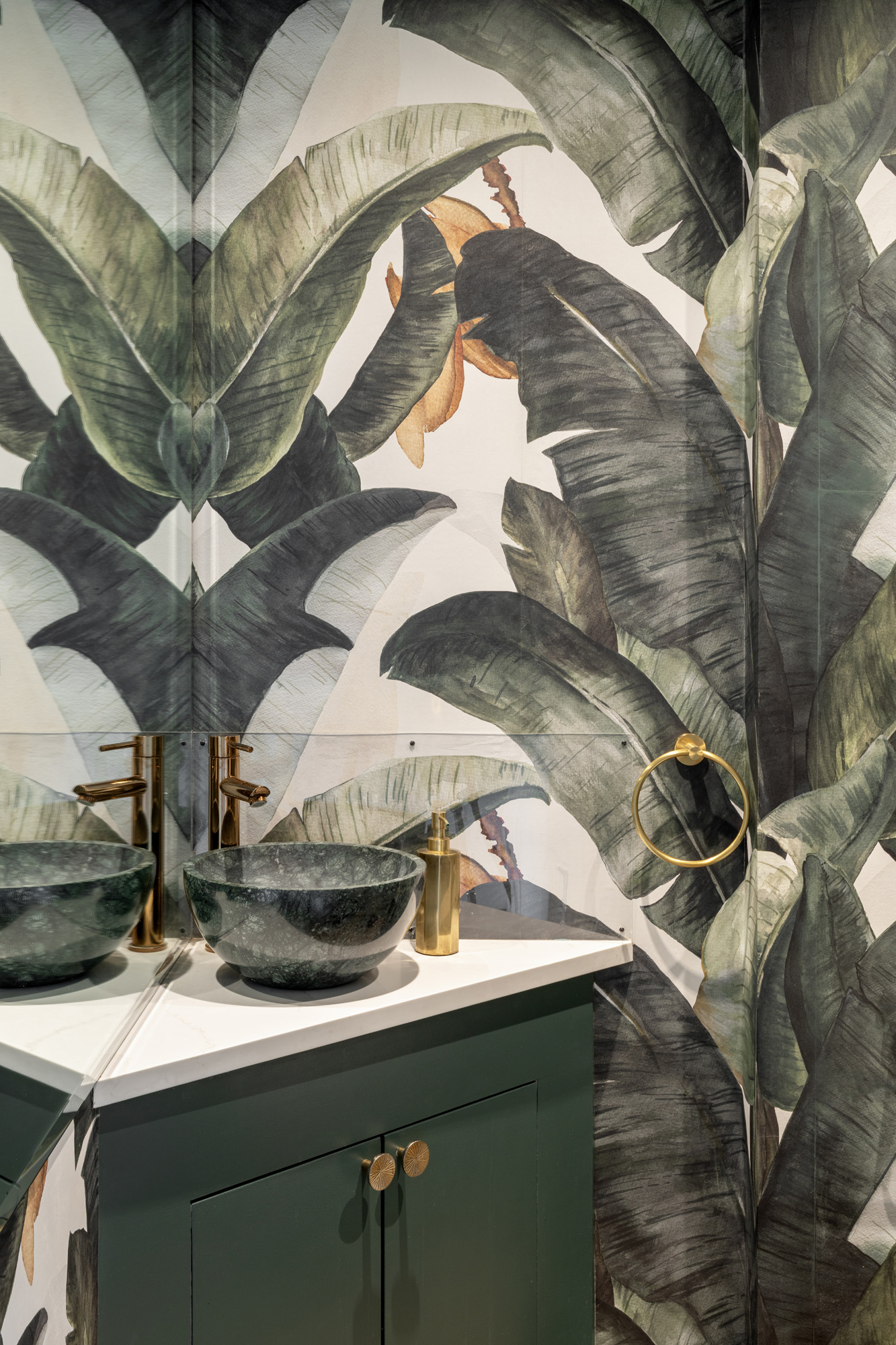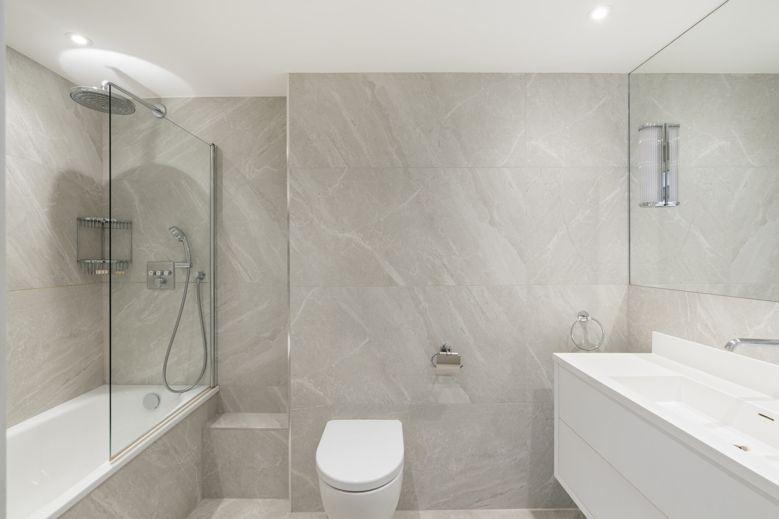 The principal bedroom suite is calming and considered in design, with built-in wardrobes, a Vispring mattress and direct access to the private balcony. Its en suite bathroom is wrapped in Mandarin Stone tilings, setting a stylish scene for the Grohe shower and dual vanity. The guest bedroom – which has versatility to be used as a home office – is equally tranquil, with pale tones and a large window. It’s served by another bathroom, featuring a bathtub. Completing the home is an additional WC – finished with bold wallpaper and a sculptural green marble sink.